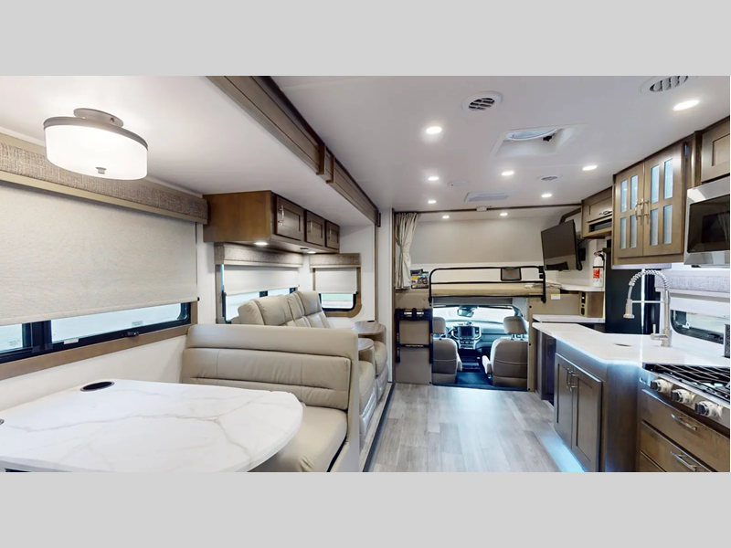 - Front Cab-Over Bunk Area with Mattress (50” x 80”) and Privacy Curtain