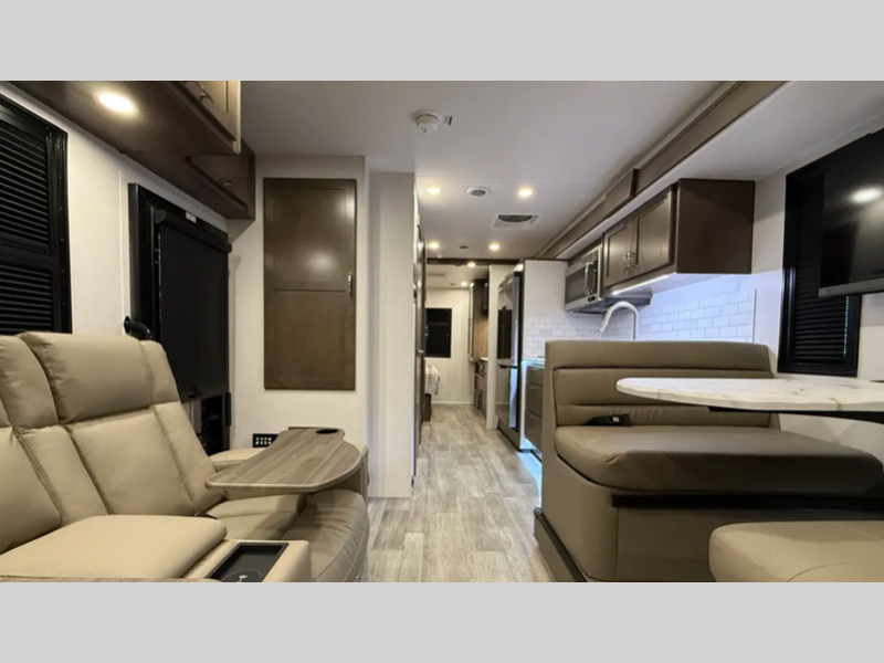 Advanced safety features include pre-collision assist (PCA) with automatic emergency braking (AEB) and an SOS post-crash alert system, providing unparalleled peace of mind. You can also stay effortlessly connected with the intuitive 8" touch screen Dash Radio with SYNC 4, featuring seamless wireless phone connection. The exterior showcases rugged 2" Aluminum-framed, laminated sidewalls with high-density block foam insulation, ensuring durability and optimal energy efficiency. Further, the interior design exudes refinement and warmth, with stunning hardwood shaker-style cabinetry and soft LED recessed ceiling lights.