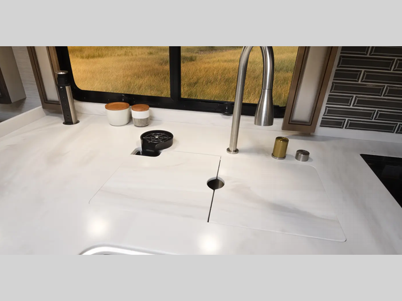 A passenger seat workstation lets your co-pilot get some work done as you drive and a 10" dash radio with color back up and side view cameras plus navigation will help get you to your destination safely and on time. The full body exterior paint is sure to turn heads as you travel and the 4-point fully auto hydraulic leveling system will have you set up at the campground in no-time! You will also love the interior with its polished porcelain tile throughout, hardwood cabinetry, roller day/night shades, and more comforts!