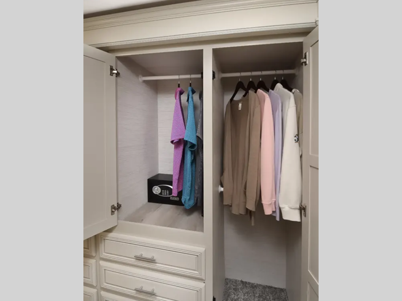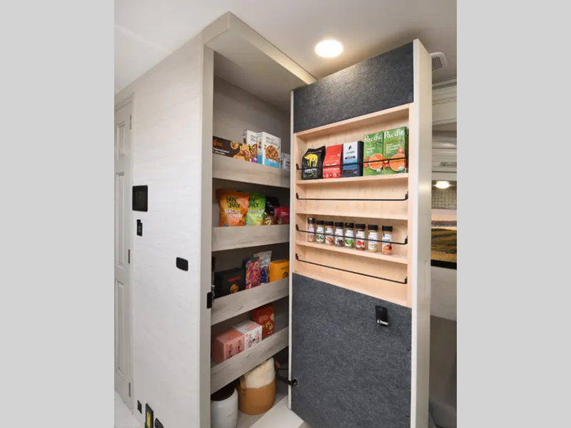 - Contoured overhead cabinets in slide rooms w/soft close hinges