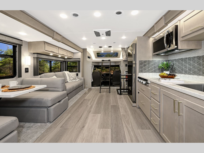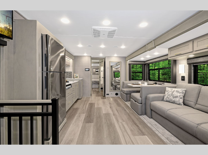 Sleeps 7 Slides 2 Length 36 ft 10 in Ext Width 8 ft 4 in Ext Height 12 ft 10 in Int Height 7 ft Interior Color Augusta, Bellport, Wilmington Exterior Color Atmos, Ion, Luminance, Recharge, Polaris, Tundra, Atlas LR, Mojave Hitch Weight 12000 lbs GVWR 35000 lbs Fresh Water Capacity 150 gals Grey Water Capacity 75 gals Black Water Capacity 75 gals Tire Size 295/75R22.5" Furnace BTU 35000 btu Generator 8kW Onan Quiet Diesel Fuel Type Diesel Engine Cummins ISB 6.7L Chassis Freightliner S2RV Horsepower 360 hp Fuel Capacity 100 gals Wheelbase 263 in Number Of Bunks 1 Available Beds Mini King Torque 800 ft-lb Refrigerator Type Residential Stainless Steel with Icemaker Refrigerator Size 18 cu ft Convection Cooking Yes Cooktop Burners 3 Number of Awnings 1 LP Tank Capacity 20.3 gals Water Heater Type Truma Comfort Plus Tankless AC BTU 30000 btu TV Info Smart LED TV; LR 42", BR 32", Ext. 32" Awning Info Electric Girard GG Lateral Arm with LED Lights Washer/Dryer Available Yes Shower Type Radius Electrical Service 50 amp Similar Floorplans