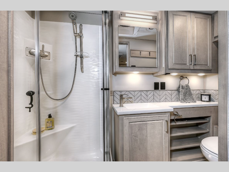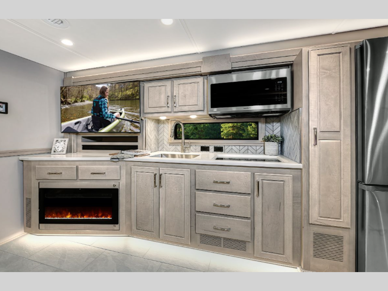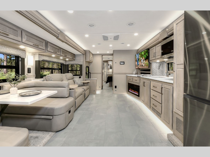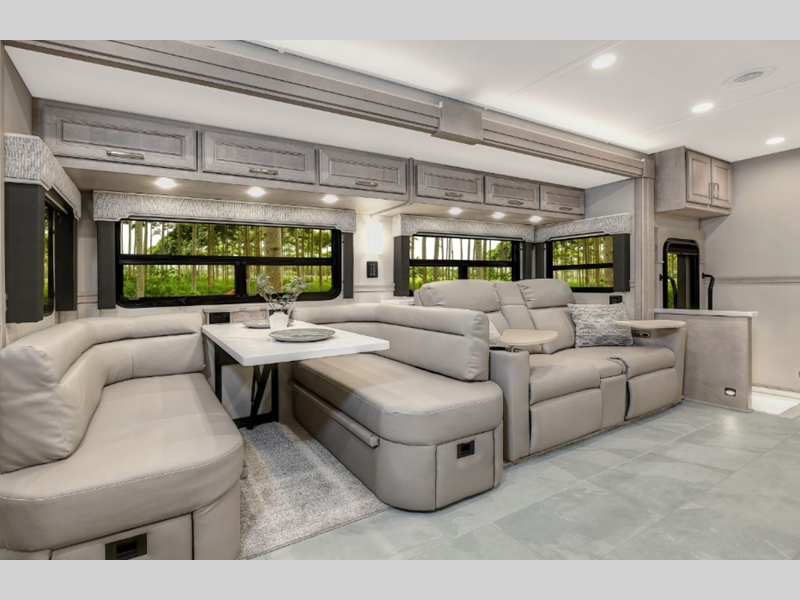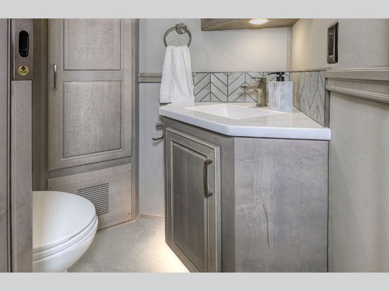 Each model sits on a durable Freightliner M2-106 Plus chassis with a Cummins L9 engine and 360 horsepower to power your trips both near and far. The Aqua-Hot 450D hydronic water and zone heating system provides endless hot water and will keep your whole coach comfortable. More convenient features include the Multiplex Control system, four-point hydraulic leveling, and a roof-mounted Girard 2-stage lateral arm awning. Inside, you will be met with maple hardwood cabinetry, solid surface countertops, stylish tile backsplash, and a cozy memory foam mattress.