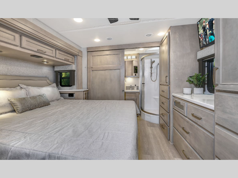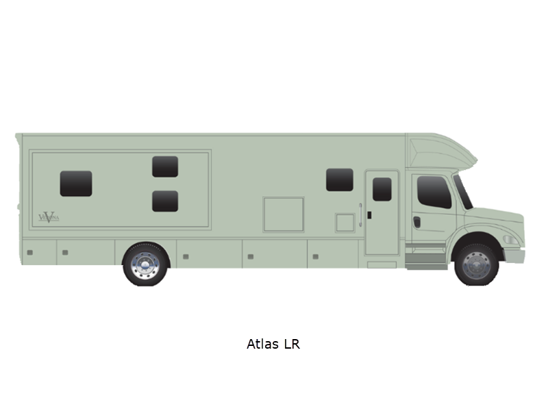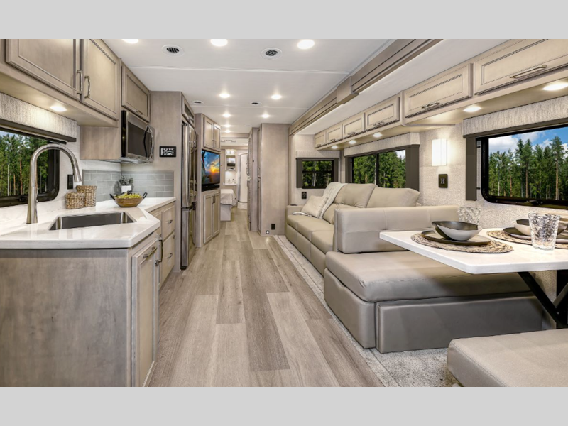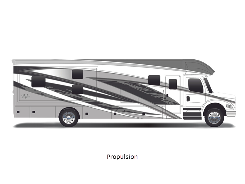 Sleeps 6 Slides 2 Length 36 ft 8 in Ext Width 8 ft 4 in Ext Height 12 ft 10 in Int Height 7 ft Interior Color Athens, Cyprus, Tuscany Exterior Color Flare, Kinetic, Propulsion, Surge, Polaris, Tundra, Atlas LR, Mojave Hitch Weight 20000 lbs GVWR 37600 lbs Fresh Water Capacity 150 gals Grey Water Capacity 75 gals Black Water Capacity 75 gals Generator 8 KW Onan Quiet Diesel Fuel Type Diesel Engine Cummins L9 Chassis Freightliner M2-106 Plus Horsepower 360 hp Fuel Capacity 100 gals Wheelbase 285 in Available Beds Mini King Torque 1150 ft-lb Refrigerator Type Stainless Steel French Door Residential Refrigerator Size 18 cu ft Convection Cooking Yes Cooktop Burners 2 Number of Awnings 1 Water Heater Type AquaHot 450D AC BTU 30000 btu TV Info LR 43" 4K Smart LED, BR 32" 4K Smart LED, Ext. 32" LED Awning Info Electric Lateral Arm w/LED Lights Washer/Dryer Available Yes Shower Type Radius Electrical Service 50 amp Similar Floorplans