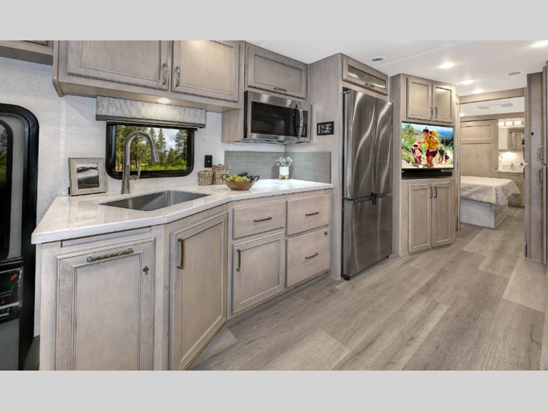 Each is built with aerodynamic fiberglass front and rear caps in two-pieces for easy replacement, a crowned fiberglass roof surface, and includes "Super Sandwich" floor construction with galvanized vapor barrier. The beautiful interior gives you luxury throughout with beautiful maple hardwood cabinets with soft closing drawers topped with solid surface countertops, stainless steel appliances, a French door refrigerator, and Ultra-Soft furniture. And the entertainment and electrical systems are something to boast about!