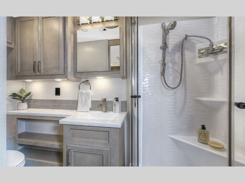 Sleeps 8 Slides 2 Length 39 ft 10 in Ext Width 8 ft 4 in Ext Height 12 ft 10 in Int Height 7 ft Interior Color Athens, Cyprus, Tuscany Exterior Color Flare, Kinetic, Propulsion, Surge, Polaris, Tundra, Atlas LR, Mojave Hitch Weight 20000 lbs GVWR 37600 lbs Fresh Water Capacity 150 gals Grey Water Capacity 75 gals Black Water Capacity 75 gals Generator 8 KW Onan Quiet Diesel Fuel Type Diesel Engine Cummins L9 Chassis Freightliner M2-106 Plus Horsepower 360 hp Fuel Capacity 100 gals Wheelbase 309 in Number Of Bunks 2 Available Beds King Torque 1150 ft-lb Refrigerator Type Stainless Steel French Door Residential Refrigerator Size 18 cu ft Convection Cooking Yes Cooktop Burners 2 Number of Awnings 1 Water Heater Type AquaHot 450D AC BTU 30000 btu TV Info LR 43" 4K Smart LED, BR 32" 4K Smart LED, Ext. 32" LED Awning Info Electric Lateral Arm w/LED Lights Washer/Dryer Available Yes Shower Type Radius Electrical Service 50 amp Similar Floorplans